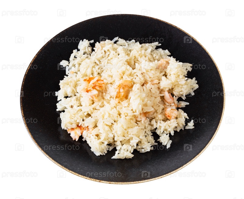 Вареный жасминовый рис с креветками на коричневой тарелке