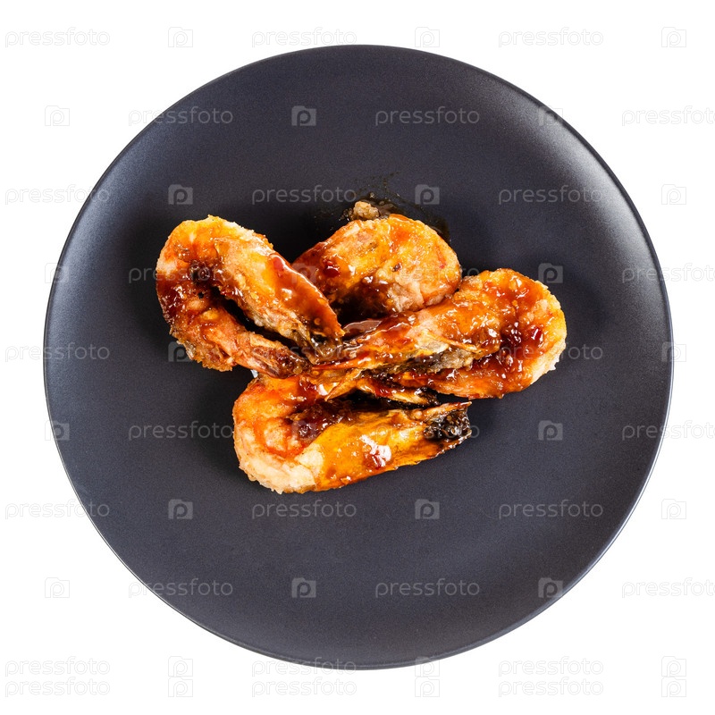 Вид сверху на жареные тигровые креветки на черной тарелке
