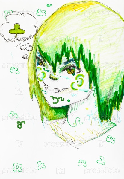Голова улыбающегося мальчика с карими глазами и зелеными волосами