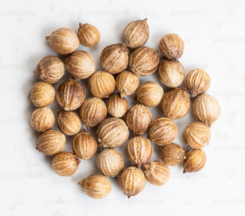 Несколько сушеных семян кориандра крупным планом на сером
