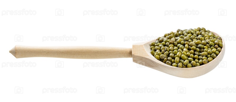 Деревянная ложка с зеленой фасолью мунг изолирована