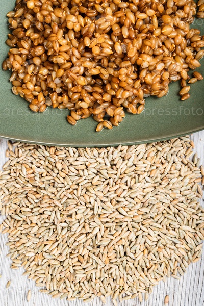 Цельные зерна ржи и каша на тарелке крупным планом