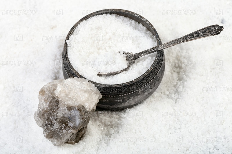 Старинная серебряная солонка и каменная соль крупным планом