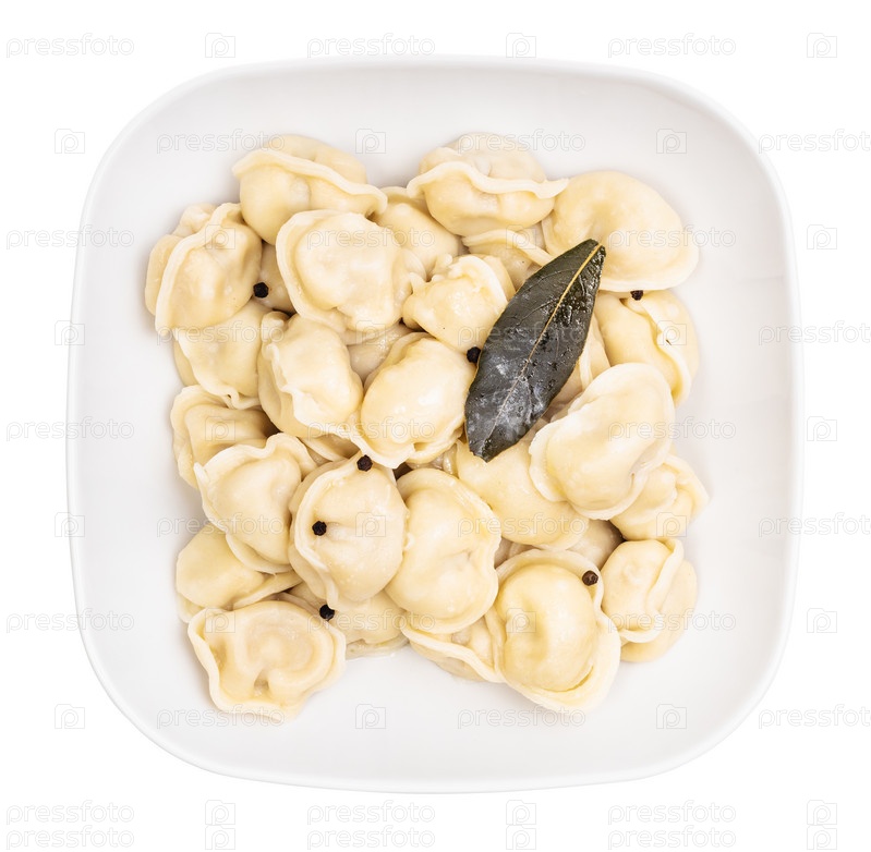 Вид сверху на вареные пельмени в серой миске изолирован