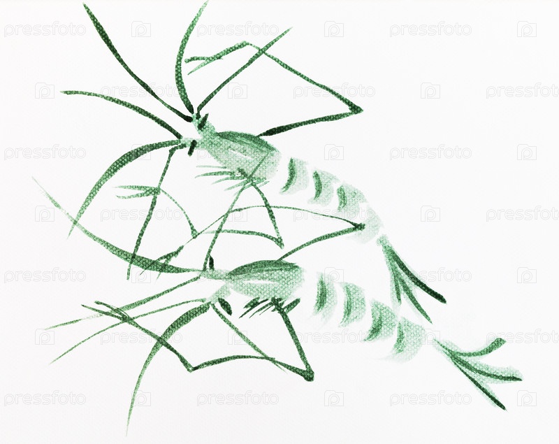 Пара зеленых креветок, нарисованных в стиле суми-э