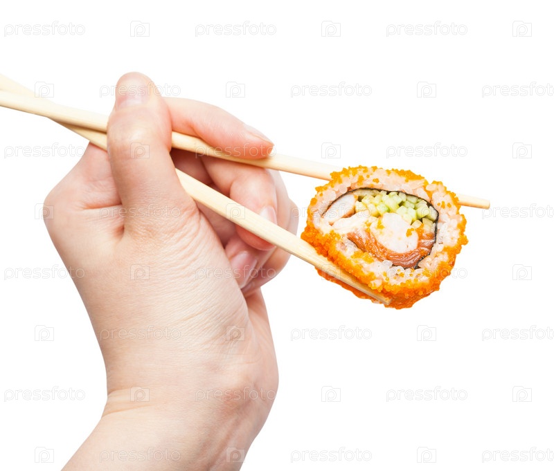 Палочки для еды держат калифорнию эби ролл изолированы