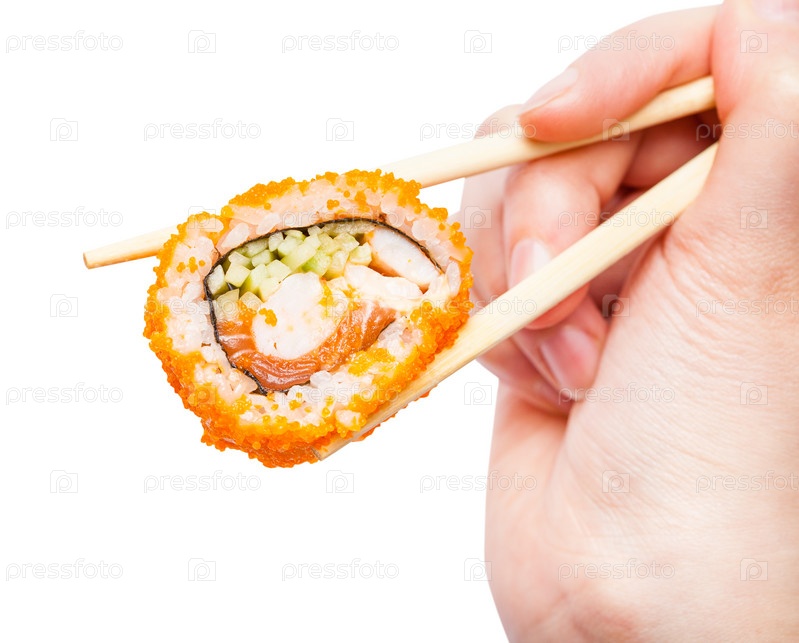 Палочки для еды держит калифорнию эби ролл крупным планом