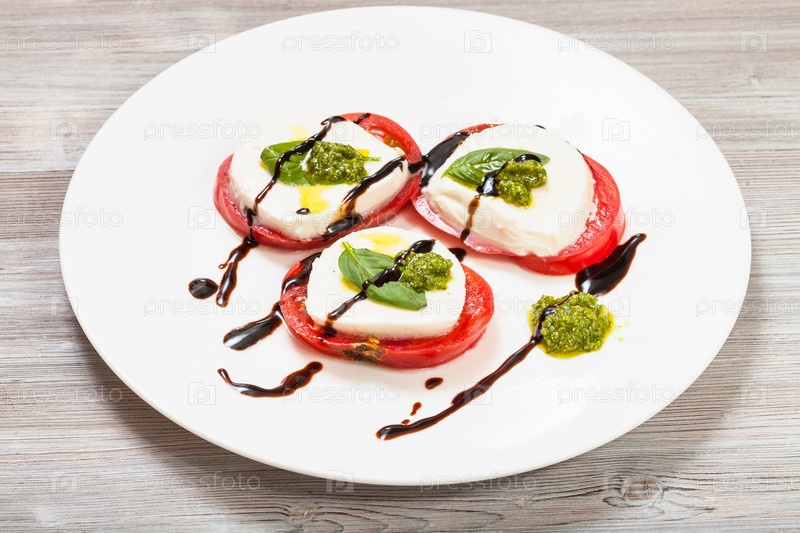 Стопки моцареллы, помидоров, базилика с соусом песто