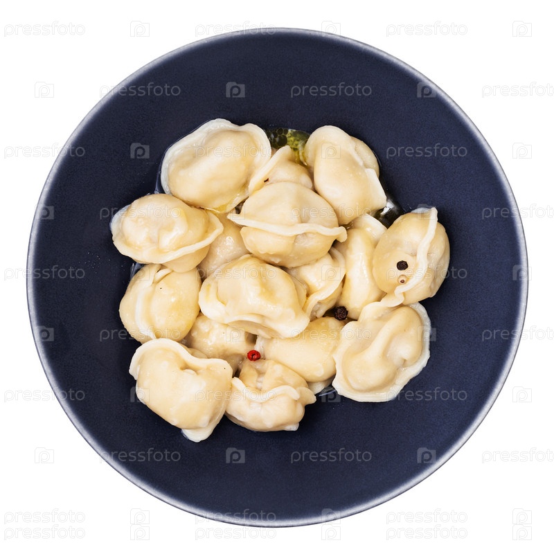 Пельмени с маслом в черной миске, изолированные на белом фоне