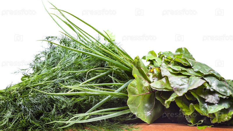Свежие пучки свекольной зелени, зеленого лука и укропа