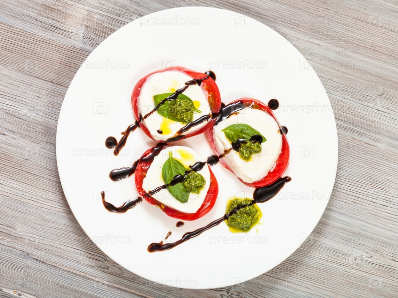 Вид сверху на моцареллу, помидоры, базилик с соусом песто