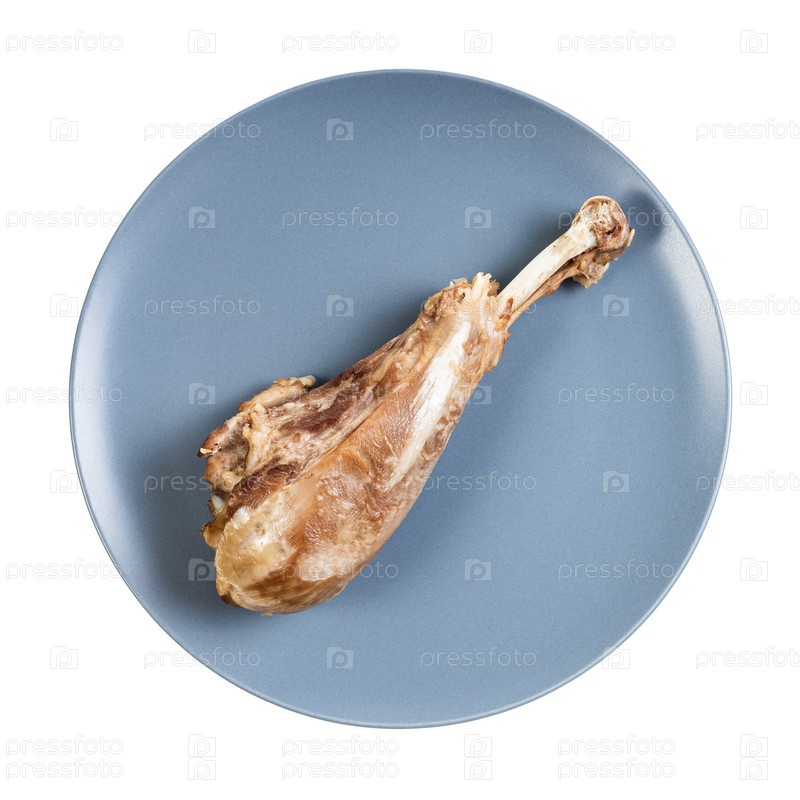 Вид сверху на одну вареную ножку индейки на синей тарелке