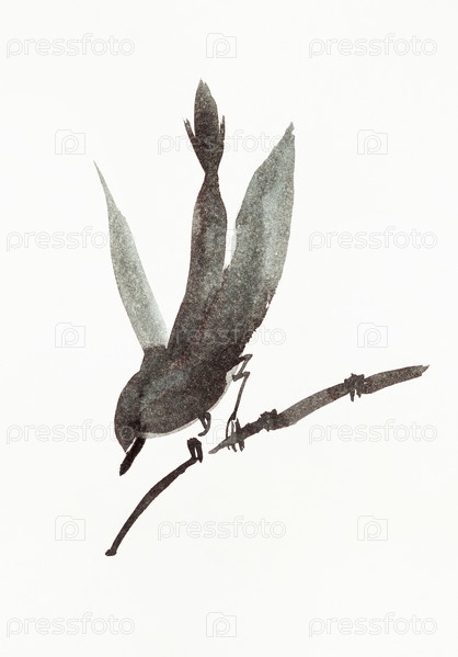 Птица на ветке, нарисованная от руки в стиле суми-э