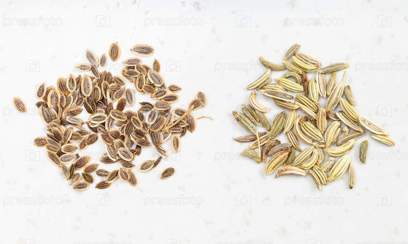 Две щепотки семян укропа и фенхеля на сером