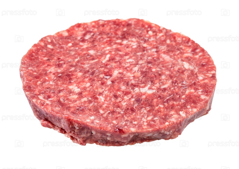 Сырой бургер из говяжьего фарша, изолированный на белом