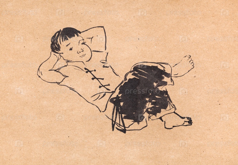 Лежащий китайский мальчик, нарисованный в стиле суми-э