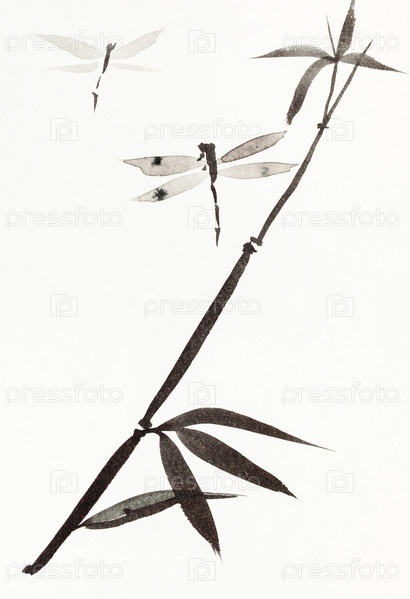 Стрекозы и тростник, нарисованные от руки в стиле суми-э