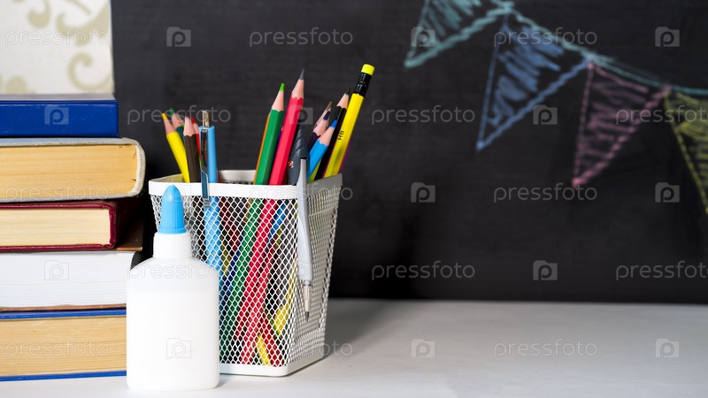 Стопка книг и подставка для карандашей с различными канцелярскими принадлежностями на фоне доски
