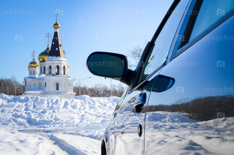 Зимний автомобиль и дорога покрыты снегом