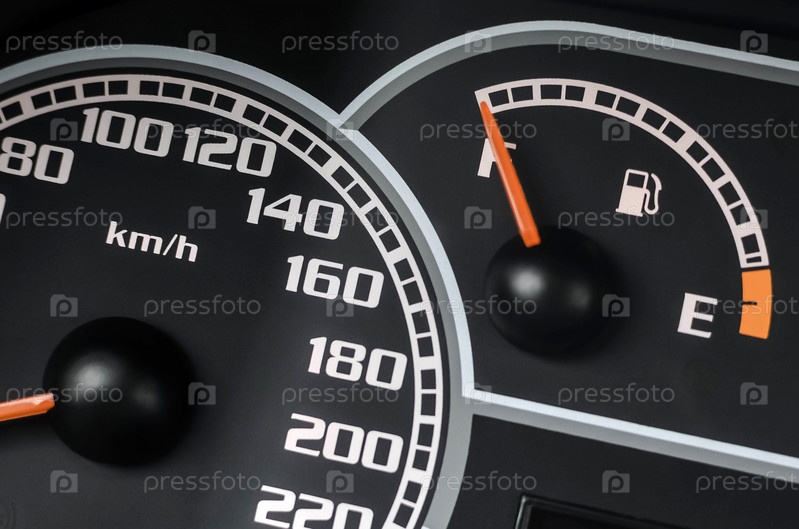 Крупный план измерителя скорости и указателя уровня топлива в автомобиле