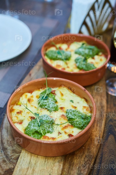 Овощная запеканка с сыром на деревенской кухне. Еда в глиняной посуде