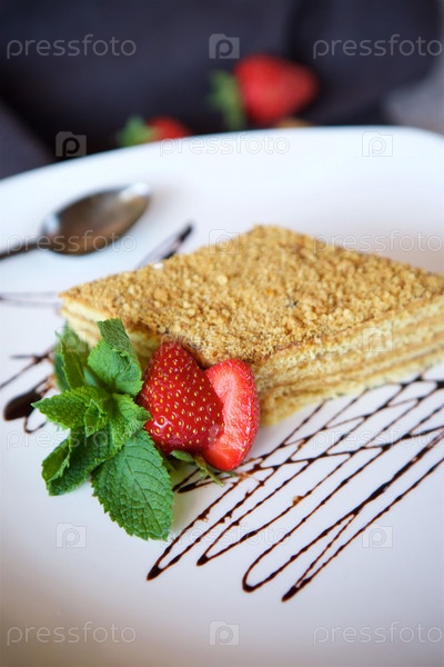 Десерт крупным планом представляет собой кусок торта или слоеного торта с кремом