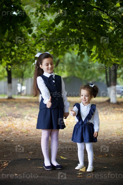 Первоклассница в держит свою милую младшую сестру