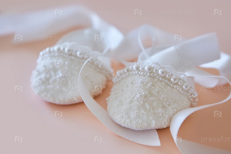 Маленькие детские пинетки с украшениями лежат на коробке с одеждой