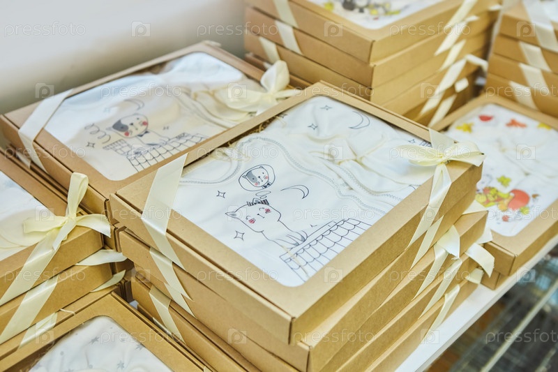 Товары, предметы одежды находятся в коробках, выставленных в магазине. Производство и продажа детской одежды