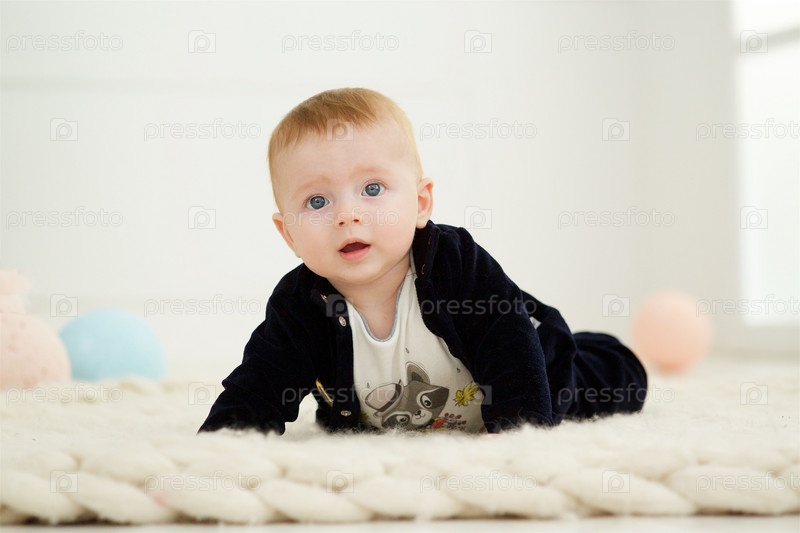 Младенец лежит на мягкой поверхности в светлой комнате, одетый в темную одежду. Концепция детства