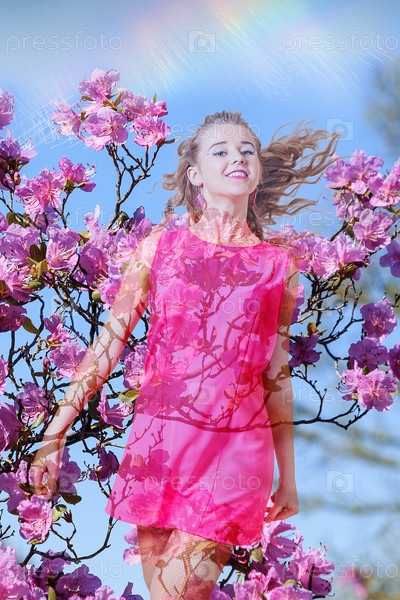 Девушка возле цветущего рододендрона