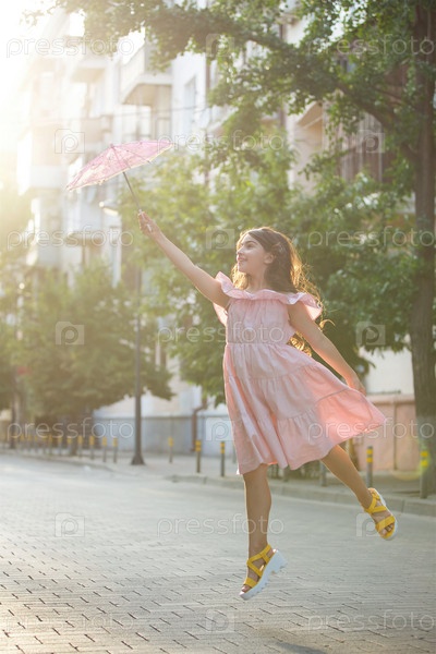 Девочка школьного возраста в розовом платье летит с зонтиком. Парящий от счастья