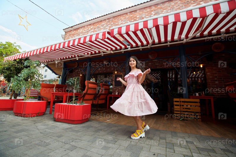 Девочка школьного возраста в розовом платье на улицах города