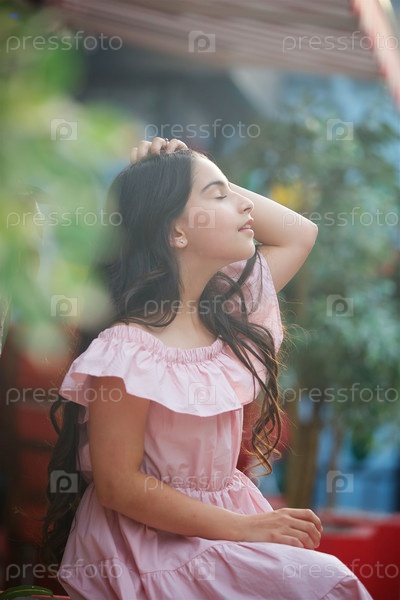 Девочка школьного возраста в розовом платье на улице города
