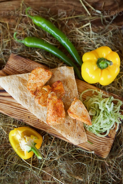 Кусочки жареного мяса на лаваше, подаются со свежим перцем и салатом на деревянной доске