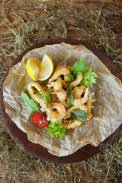 Креветки, кольца кальмаров и другие морепродукты, обжаренные во фритюре в кляре