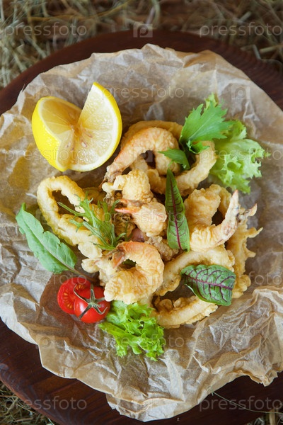 Креветки, кольца кальмаров и другие морепродукты, обжаренные во фритюре в кляре