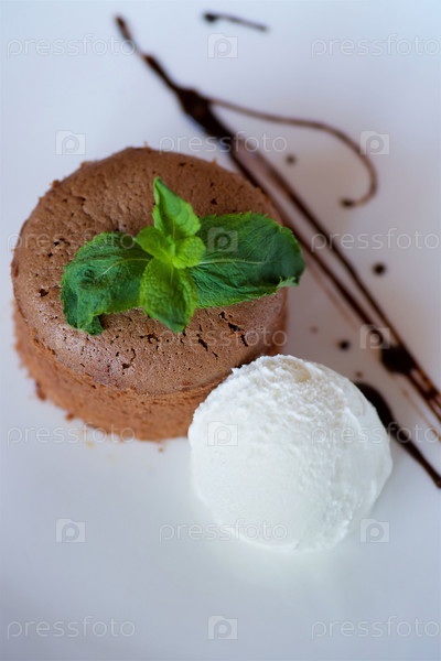 Кекс или маффин с шоколадной начинкой лежит на тарелке с мороженым. Блюдо украшено для подачи