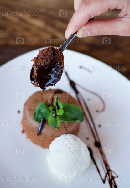 Кекс или маффин с шоколадной начинкой лежит на тарелке с мороженым. Блюдо украшено для подачи