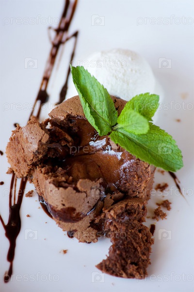 Кекс или маффин с шоколадной начинкой лежит на тарелке с мороженым. Блюдо украшено для подачи