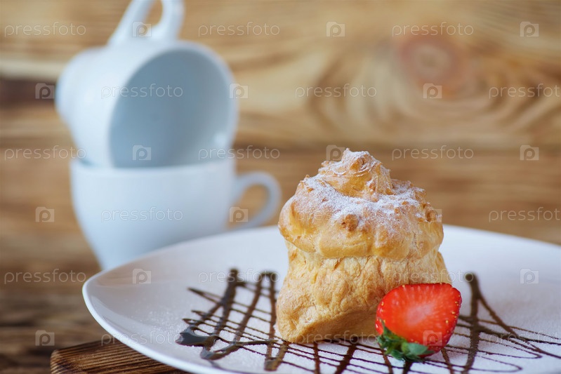 Эклеры торта лежат на белой тарелке на шоколадной подливке. Изделие посыпано белой сахарной пудрой и украшено свежей клубникой
