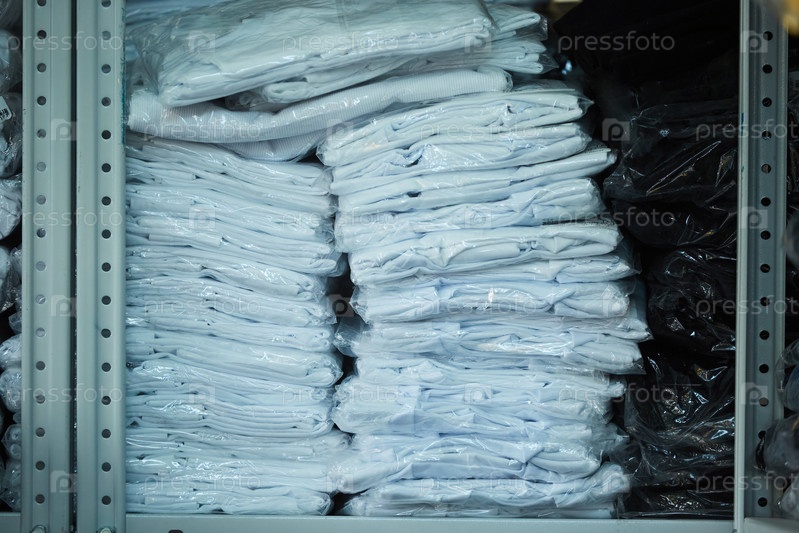 Товарные предметы одежды находятся на полке на складе. Выбор текстильной продукции для продажи