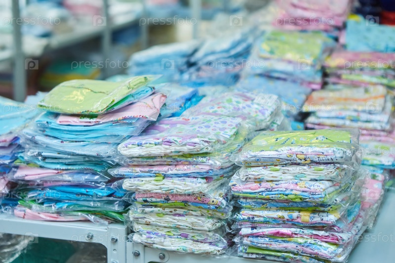 Товарные предметы одежды находятся на полке на складе. Выбор текстильной продукции для продажи
