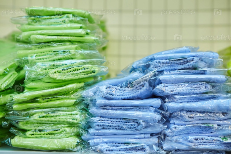 Товарные предметы одежды находятся на полке на складе. Выбор текстильной продукции для продажи