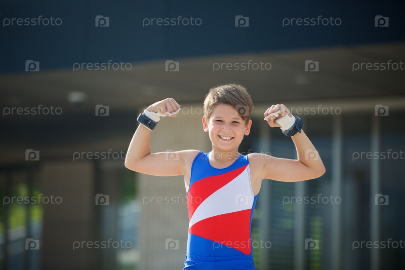 Мальчик-гимнаст школьного возраста в костюме демонстрирует элементы спорта. Мальчик-гимнаст школьного возраста в костюме демонстрирует элементы спорта