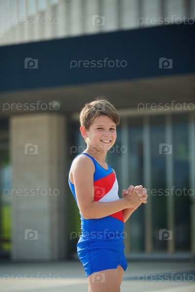 Мальчик-гимнаст школьного возраста в костюме демонстрирует элементы спорта. Мальчик-гимнаст школьного возраста в костюме демонстрирует элементы спорта