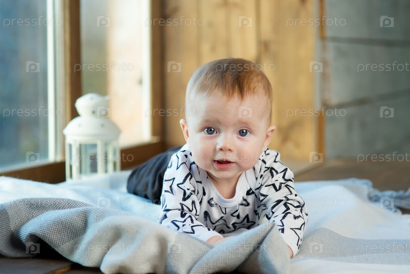 Малышка лежит на мягком одеяле, одетая в модную одежду. Концепция детства