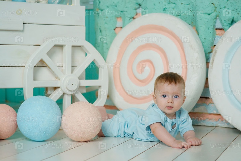 Младенец лежит на мягкой поверхности в светлой комнате, одетый в темную одежду. Концепция детства