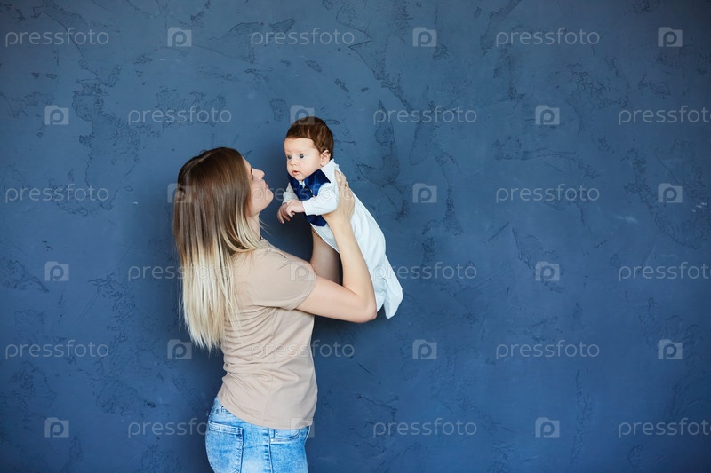 Мама со своим новорожденным мальчиком на фоне синей стены. Понятие материнства и детства