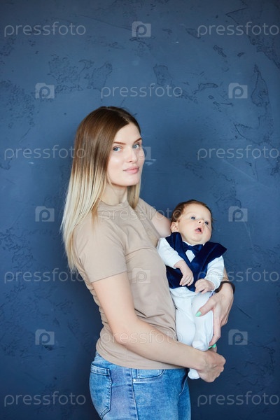 Мама со своим новорожденным мальчиком на фоне синей стены. Понятие материнства и детства